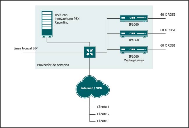 La solución de Comunicaciones unificadas puede trabajar en varios equipos. La adptación a las dimensiones del sistema global es posible en todo momento.La centralita VoIP puede estar instalada en un Media Gateway mientras el sistema se encuentre todavía en fase de crecimiento. Para instalaciones con un cierto tamaño se utiliza el Gateway IP0010 que asume de forma dedicada a las funcionalidades de la centralita VoIP innovaphone PBX. Instalaciones de tamaño aún mayor son el escenario perfecto para el uso de la innovaphone Virtual Appliance (IPVA).