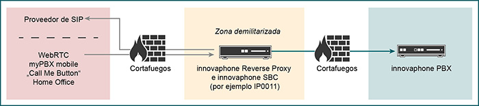 La comunicación sin barreras y la movilidad (Anywhere Workplace) representan también un importante reto adicional desde el punto de vista de la seguridad, tal y como sucede con aquellas soluciones de Comunicaciones Unificadas que utilizan WebRTC. El innovaphone Reverse Proxy es el encargado de la seguridad de la PBX innovaphone en los escenarios Anywhere Workplace. Se trata de un elemento autónomo de la PBX innovaphone que actúa como instancia central desde donde se gestionan todas las conexiones a internet. Al igual que el innovaphone Session Border Controller, el innovaphone Reverse Proxy puede funcionar como proceso independiente en la PBX innovaphone o instalarse en un gateway VoIP innovaphone separado (por ej. el IP0011)