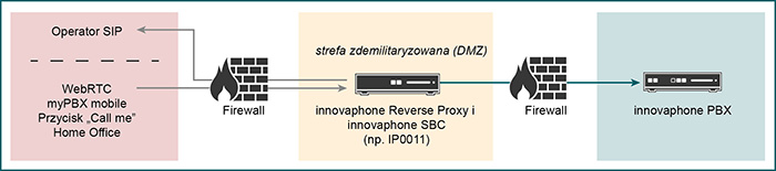 Szczególnym wyzwaniem w stosunku do bezpieczeństwa i ochrony danych jest potrzeba nieograniczonej komunikacji i mobilności (Anywhere Workplace) oraz w przypadku rozwiązań Unified Communications, które wykorzystują protokół komunikacyjny WebRTC. innovaphone Reverse Proxy jest odpowiedzią na kwestię bezpieczeństwa w scenariuszu Anywhere Workplace. Stanowi on ważny element koncepcji bezpieczeństwa innovaphone, jest niezależną częścią centrali innovaphone i centralnym organem dla wszystkich połączeń przychodzących z Internetu. Pozwala to na wykrycie i zablokowanie ataków na wczesnym etapie. Tak jak w przypadku innovaphone Session Border Controller również innovaphone Reverse Proxy może być skonfigurowany jako indywidualny proces w systemie innovaphone PBX lub może być oddzielnie zainstalowany na bramce innovaphone VoIP, np. na bramie IP0011.